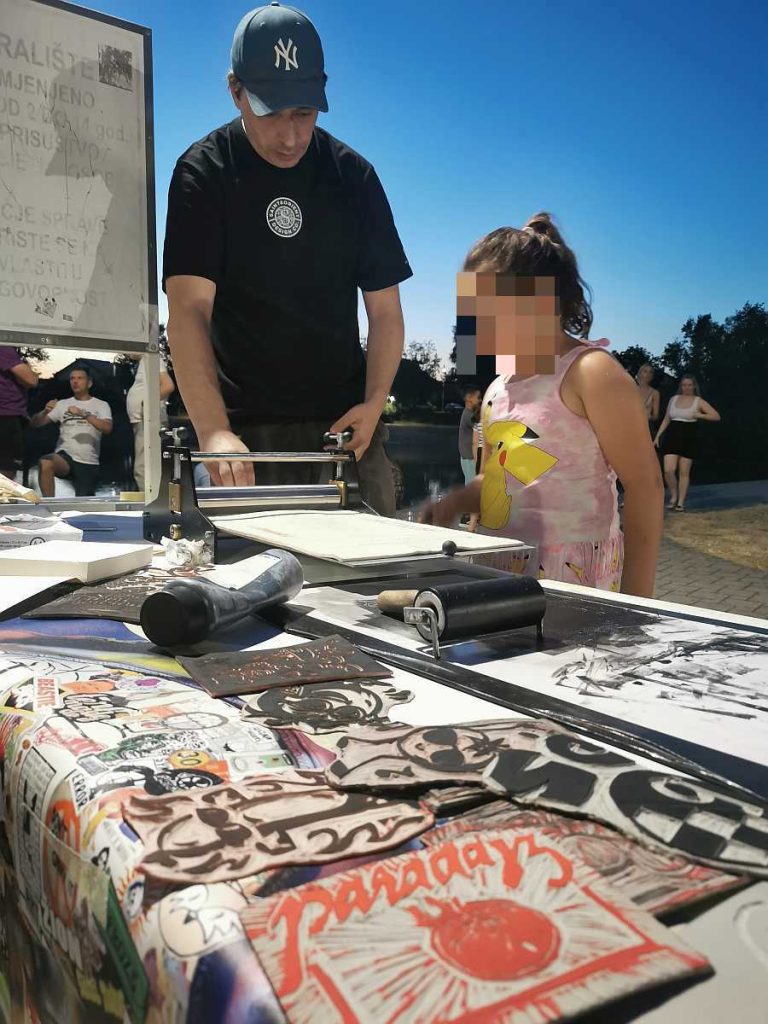 Veliko nam je veselje biti ponovo u Svetoj Nedelji a pogotovo kad je tu još i Paradajz Festival. Ove smo godine gostovali u malo izmijenjenom timu gdje nam se po prvi puta pridružila kolegica Janja sa svojom radionicom tiskanja LEGO-grafika a za tiskarskom prešom našao se i veteran graffiti scene – umjetnik i dizajner Mislav The Saint!